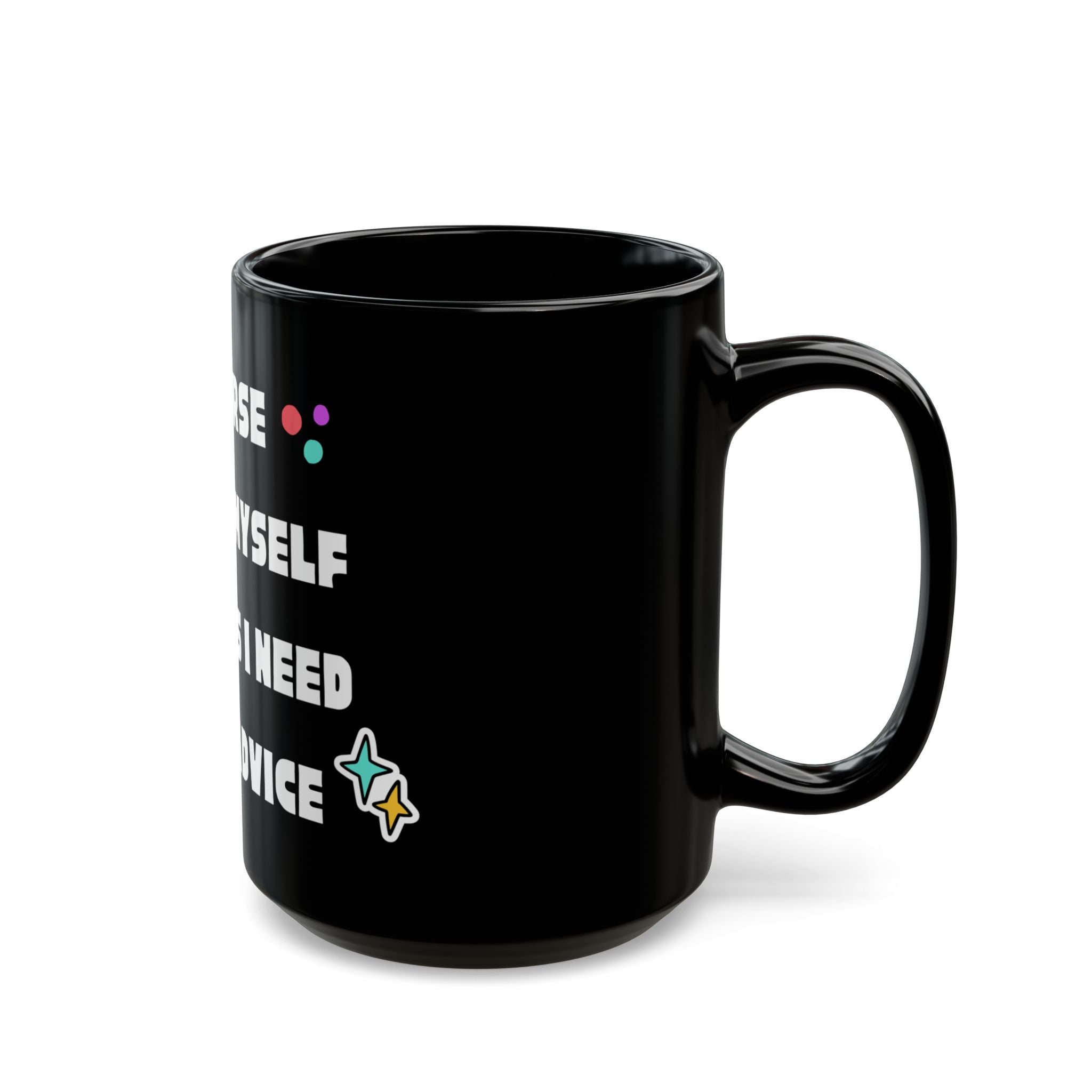 This black ceramic mug with a glossy finish features the humorous quote, 'Of course I talk to myself. Sometimes I need expert advice.' Perfect for anyone who enjoys a good laugh while sipping on their favorite hot beverage. Ideal gift for friends and family for birthdays, holidays, or any special occasion.